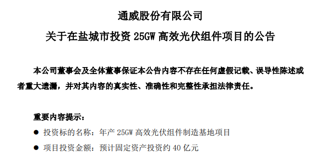 中國粉體網(wǎng)訊 9月22日,通威股份發(fā)布公告,公司擬與鹽城經(jīng)開區(qū)管委會簽署高效光伏組件制造基地項目投資協(xié)議書,擬投建25GW高效光伏組件制造基地項目,建設(shè)周期為24個月,預(yù)計固定資產(chǎn)投資額約為40億元。