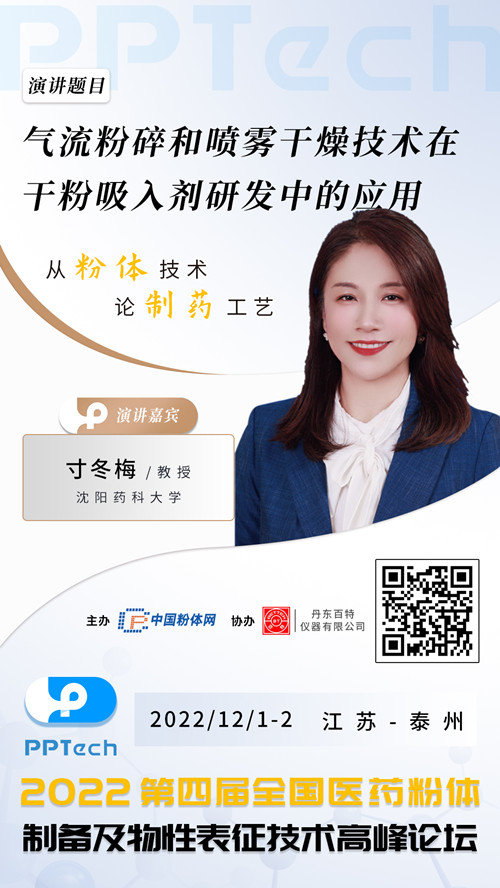 干粉吸入劑的制備離不開醫(yī)藥粉體制備技術的應用。2022年12月1-2日,中國粉體網(wǎng)將在江蘇泰州碧桂園鳳凰酒店舉辦“第四屆全國醫(yī)藥粉體制備及物性表征技術高峰論壇”,屆時將邀請來自沈陽藥科大學的寸冬梅教授作《氣流粉碎和噴霧干燥技術在干粉吸入劑研發(fā)中的應用》報告,報告人從自己的研究領域出發(fā),詳細介紹氣流粉碎和噴霧冷凍干燥技術在干粉吸入劑中的應用。