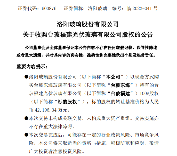 1洛陽(yáng)玻璃收購(gòu)臺(tái)玻福建 進(jìn)一步擴(kuò)大光伏玻璃產(chǎn)能