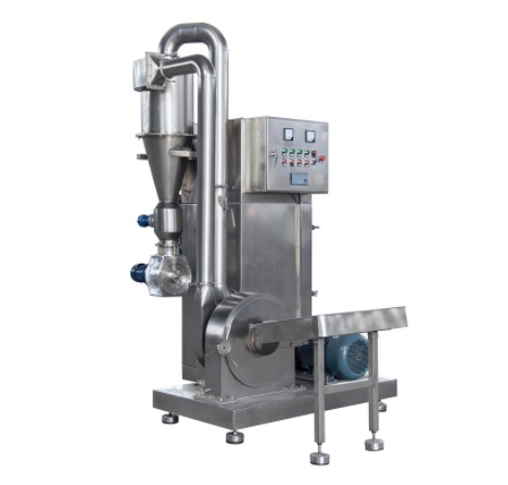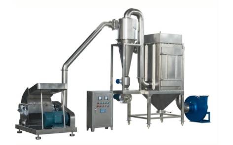 本機(jī)利用固定齒盤與活動錘片間的相對運動,使物料在機(jī)腔內(nèi)被沖擊剪切而快速獲得粉碎。粉碎后的物料經(jīng)離心力和引風(fēng)機(jī)的作用,自動進(jìn)入旋風(fēng)分離器,成品經(jīng)過出料風(fēng)機(jī)收集,粉塵自動吸入除塵箱,經(jīng)過布袋過濾、回收,降低物料的損耗率,有效改善工作環(huán)境。
