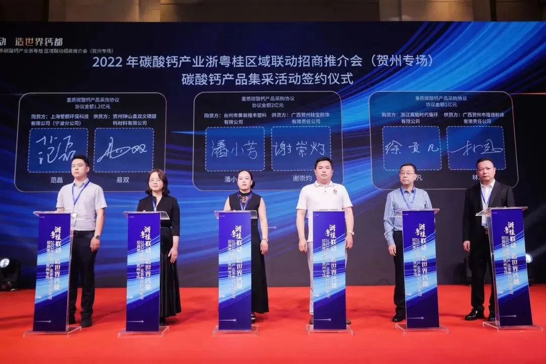 推介會上,賀州市副市長匡永紅代表市人民政府與企業(yè)代表進(jìn)行簽約。本次簽約項(xiàng)目共13個(gè),簽約投資總額達(dá)102.96億元,F(xiàn)場舉行了碳酸鈣產(chǎn)品集采簽約活動,集采協(xié)議金額達(dá)19.2億元,其中協(xié)會執(zhí)行會長單位廣西賀州市科隆粉體有限公司重質(zhì)碳酸鈣產(chǎn)品采購協(xié)議金額5億元,副會長單位賀州鐘山縣雙文碳酸鈣新材料有限公司重質(zhì)碳酸鈣產(chǎn)品采購協(xié)議金額1.2億元。