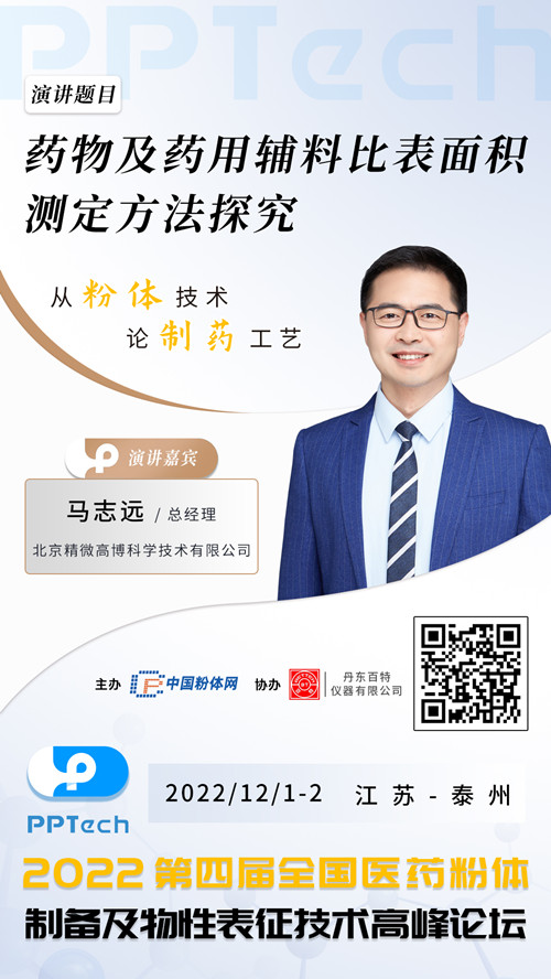 由于比表面積測(cè)定在藥品研究中應(yīng)用廣泛,因此,對(duì)于藥物及藥用輔料比表面積測(cè)定方法的研究一直在精益求精。為滿足廣大制藥企業(yè)及新老客戶對(duì)行業(yè)前沿的需求,中國(guó)粉體網(wǎng)將于2022年12月1-2日在江蘇泰州碧桂園鳳凰酒店舉辦“第四屆全國(guó)醫(yī)藥粉體制備及物性表征技術(shù)高峰論壇”,屆時(shí)邀請(qǐng)來(lái)自北京精微高博科學(xué)技術(shù)有限公司的馬志遠(yuǎn)總經(jīng)理作《藥物及藥用輔料比表面積測(cè)定方法探究》報(bào)告,報(bào)告主講人將結(jié)合藥品制造過(guò)程中的具體實(shí)例,如:列舉藥物及藥用輔料比表面積測(cè)試的關(guān)注指標(biāo)、深度分析比表面積測(cè)試實(shí)驗(yàn)數(shù)據(jù),從多個(gè)角度講述不同技術(shù)要點(diǎn)。同時(shí),通過(guò)對(duì)北京精微高博科學(xué)技術(shù)有限公司設(shè)備、技術(shù)方案、應(yīng)用范圍一一介紹,帶大家一窺市場(chǎng)態(tài)勢(shì)。