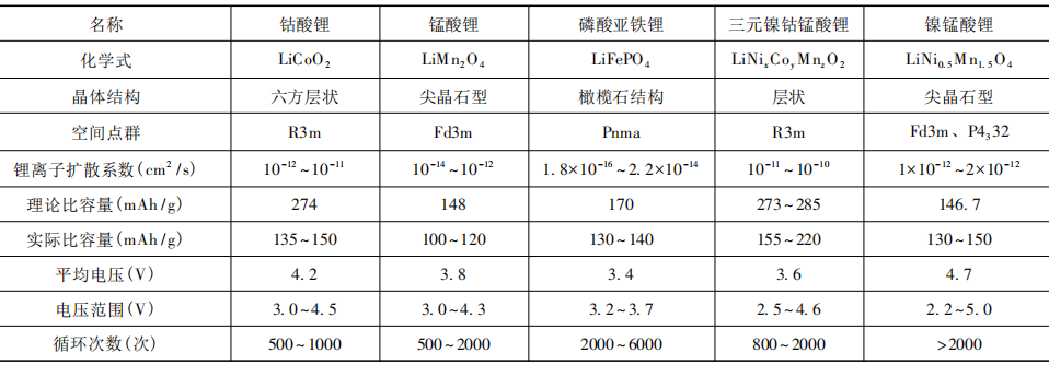 常見(jiàn)的鋰離子電池正極材料基本性能參數(shù)(來(lái)源:陳孟等,《鋰離子電池鎳錳酸鋰正極材料研究進(jìn)展》)