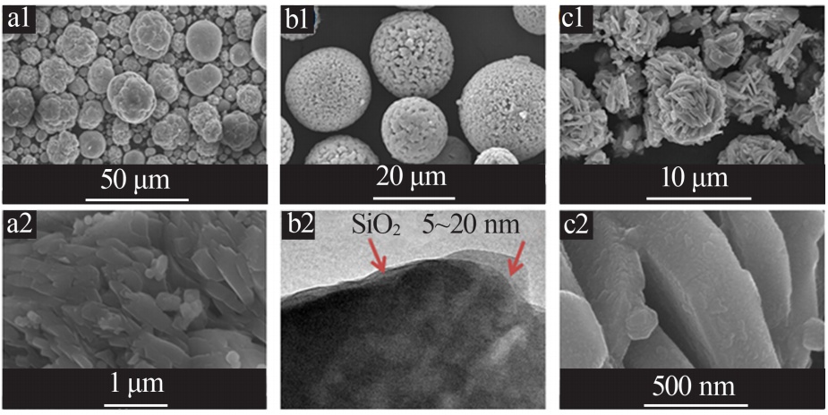原始LNMO的FE-SEM圖(a1,a2)、SiO2-包覆LNMO的FE-SEM圖(b1)和TEM圖(b2)、PI-包覆LNMO的FE-SEM圖(c1,c2)(來(lái)源:周蘭等,《界面化學(xué)對(duì)鎳錳酸鋰正極材料電化學(xué)性能影響的研究現(xiàn)狀及分析》)