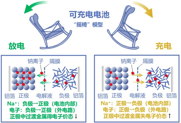 鈉離子電池的工作原理與鋰離子電池類似,屬于“搖椅”模型可充電電池。利用鈉離子在正負極之間嵌脫過程實現(xiàn)充放電。充電時,鈉離子從正極脫出經(jīng)過電解質(zhì)嵌入負極,同時電子的補償電荷經(jīng)外電路供給到負極,保證正負極電荷平衡;放電時則相反,鈉離子從負極脫嵌,經(jīng)過電解質(zhì)嵌入正極。在正常的充放電情況下,鈉離子在正負極間的嵌入脫出不破壞電極材料的基本化學結(jié)構(gòu)。