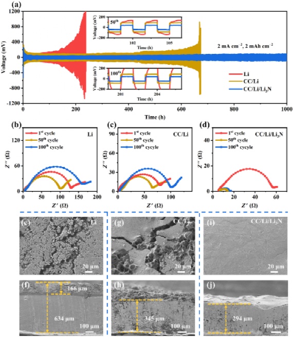 圖3.CC/Li/Li3N為工作電極組裝的對(duì)稱電池循環(huán)性能和循環(huán)后的電極形貌