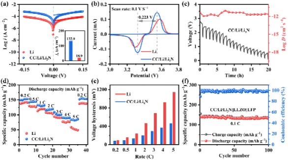 為了進(jìn)一步評(píng)估CC/Li/Li3N電極在實(shí)際應(yīng)用中的可行性,通過(guò)全電池測(cè)試探索了其電化學(xué)性能。CC/Li/Li3N||LFP全電池在液態(tài)電解質(zhì)中顯示出良好的倍率性能和循環(huán)穩(wěn)定性,并且在固態(tài)電池中經(jīng)過(guò)100次循環(huán)后顯示出96.7%的高容量保持率。