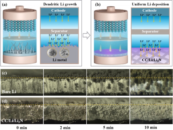 圖5.Li+在CC/Li/Li3N電極上的傳輸機(jī)理示意圖及原位光學(xué)顯微鏡觀察鋰沉積