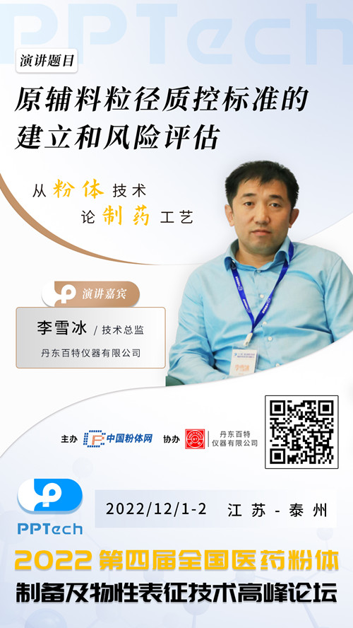 基于粒度分布差異大,原輔料晶型復雜等原因,對于原輔料的粒徑大小的檢測成為了許多制藥企業(yè)的難題。如何按照藥典和FDA的要求,選擇合適的原輔料粒徑檢測質(zhì)控標準并診斷和評估最后的測試結果呢?為滿足廣大制藥企業(yè)及新老客戶對行業(yè)難題的破解需求,中國粉體網(wǎng)以“從粉體技術,論制藥工藝”為主題,將于2022年12月1-2日在江蘇泰州碧桂園鳳凰酒店舉辦“第四屆全國醫(yī)藥粉體制備及物性表征技術高峰論壇”,會上邀請來自丹東百特儀器有限公司的技術總監(jiān)李雪冰博士作《原輔料粒徑質(zhì)控標準的建立和風險評估》報告,報告主講人將以原輔料粒徑質(zhì)控標準檢測為主題,解答粒度檢測相關的疑難問題,并將相應的粒度檢測解決方案傳授給大家。
