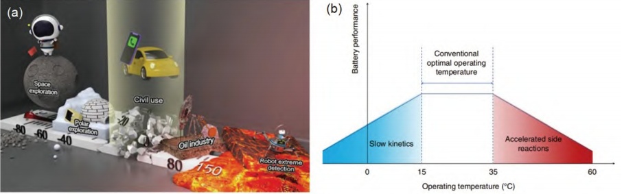 多應(yīng)用場(chǎng)景既體現(xiàn)了鋰電池的優(yōu)勢(shì),也是其發(fā)展的驅(qū)動(dòng)力。在電動(dòng)汽車、便攜式電子設(shè)備等應(yīng)用場(chǎng)景,鋰電池只需要滿足15~35°C的工作溫度。然而在一些特殊應(yīng)用場(chǎng)景需要鋰電池突破該溫度范圍。