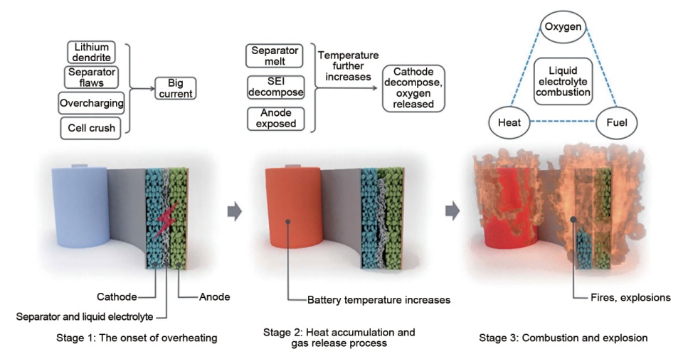 鋰電池?zé)崾Э剡^(guò)程的三個(gè)階段(來(lái)源:歐宇等,鋰離子電池中的智能安全電解液研究進(jìn)展)