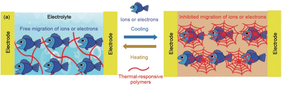 通過(guò)可逆的熱響應(yīng)聚合物來(lái)抑制電極之間的離子或電子傳導(dǎo)以防止電化學(xué)存儲(chǔ)設(shè)備的熱失控(來(lái)源:歐宇等,鋰離子電池中的智能安全電解液研究進(jìn)展)