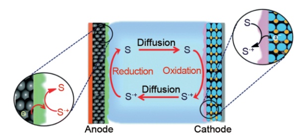 在過(guò)充過(guò)程中,氧化還原穿梭分子在正極側(cè)失去電子被氧化,形成的自由基陽(yáng)離子將擴(kuò)散回負(fù)極得到電子被還原。整個(gè)過(guò)程循環(huán)進(jìn)行,直到電池內(nèi)的過(guò)載電流被消耗殆盡。氧化還原穿梭添加劑通過(guò)在電極兩側(cè)的可逆反應(yīng)將過(guò)充提供的多余電量轉(zhuǎn)化成熱,避免電極與電解液間的副反應(yīng),保護(hù)電池組件在高壓下免受損失。與其他安全保護(hù)添加劑(成膜劑、阻燃劑、鋁緩蝕劑、用于過(guò)充保護(hù)的電聚合劑等)不同,氧化還原穿梭劑由于其可逆反應(yīng)機(jī)理,可以在不影響電池其他電化學(xué)性能的前提下提供連續(xù)可逆過(guò)充保護(hù)。
