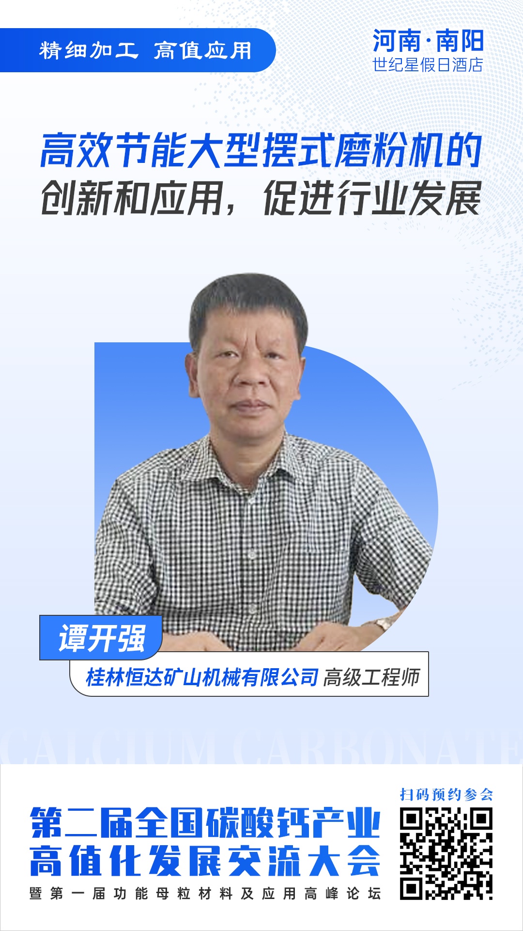 3月16~17日,粉體網(wǎng)主辦的“第二屆全國碳酸鈣產(chǎn)業(yè)高值化發(fā)展交流大會”將在河南·南陽舉行,屆時桂林恒達礦山機械有限公司高級工程師譚開強將在大會上做“高效節(jié)能大型擺式磨粉機的創(chuàng)新和應(yīng)用,促進行業(yè)發(fā)展”專題報告,為大家解答擺式磨粉機創(chuàng)新的秘密,為粉體加工企業(yè)選用設(shè)備出謀劃策。