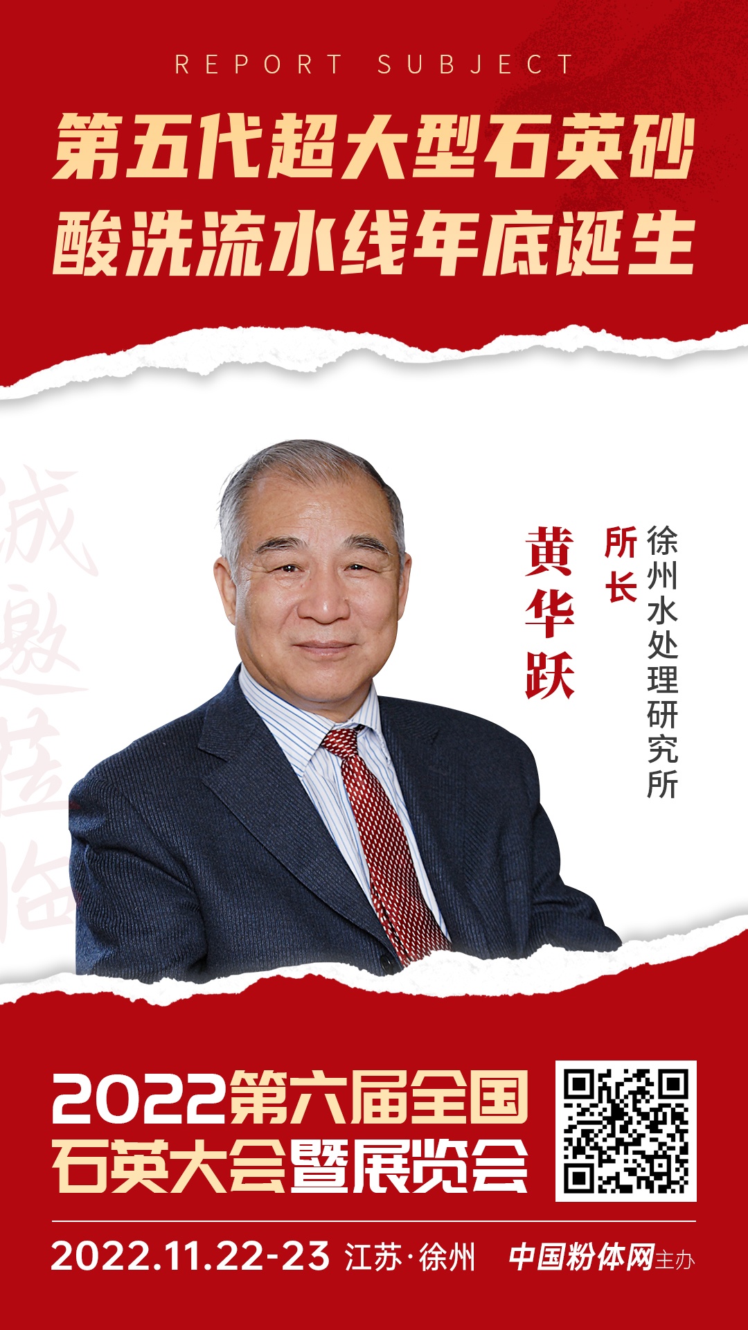 2022年11月22日至23日,中國粉體網(wǎng)將在江蘇徐州舉辦“2022第六屆全國石英大會暨展會”。屆時,來自徐州水處理研究所的黃華躍所長將做《第五代超大型石英砂酸洗流水線年底誕生》的報告,他將介紹徐州水處理研究所石英砂酸洗技術開發(fā)近十年來所取得的巨大進步,以及最新的第五代酸洗提純技術。