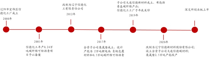 信德新材成立之初經(jīng)營(yíng)碳纖維可紡瀝青,工廠位于遼陽(yáng),產(chǎn)能0.24萬(wàn)噸,已于2019年底關(guān)停。公司在大連下設(shè)三家全資子公司,公司于2017年在大連長(zhǎng)興島設(shè)立的奧晨隆,其設(shè)計(jì)產(chǎn)能為2萬(wàn)噸鋰電池負(fù)極包覆材料和0.5萬(wàn)噸碳纖維可紡瀝青,2020年投產(chǎn);公司于2019年成立大連信德新材料(于2020年6月變更為全資子公司),布局瀝青基碳纖維產(chǎn)品;公司于2020年成立大連信德碳材料,為IPO募投項(xiàng)目“年產(chǎn)3萬(wàn)噸碳材料產(chǎn)業(yè)化升級(jí)建設(shè)項(xiàng)目”的實(shí)施主體,在擴(kuò)大產(chǎn)能的同時(shí),向上游延伸產(chǎn)業(yè)鏈至更易得的大宗商品乙烯焦油。