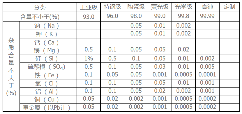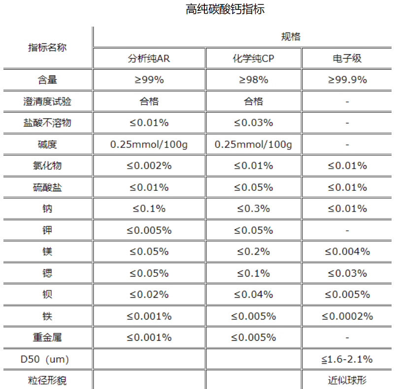 以某企業(yè)對(duì)高純碳酸鈣的劃分為例,碳酸鈣含量93.0為工業(yè)級(jí),96.0為特鋼級(jí),98.0為陶瓷級(jí),99.0為熒光級(jí),99.8為光學(xué)級(jí),99.99為高純。按照國家和主管部門頒布的化學(xué)品純度質(zhì)量指標(biāo),碳酸鈣也可分為,優(yōu)級(jí)純99.8%(GR)、分析純99.7%(AR)和化學(xué)純≥99.5%(CP)3種。除此之外,在實(shí)際應(yīng)用中企業(yè)對(duì)碳酸鈣純度的要求也各有不同,如醫(yī)藥材料99.0%,電子材料99.5%,化學(xué)試劑99.3%,高純鈣鹽合成99.99%等。