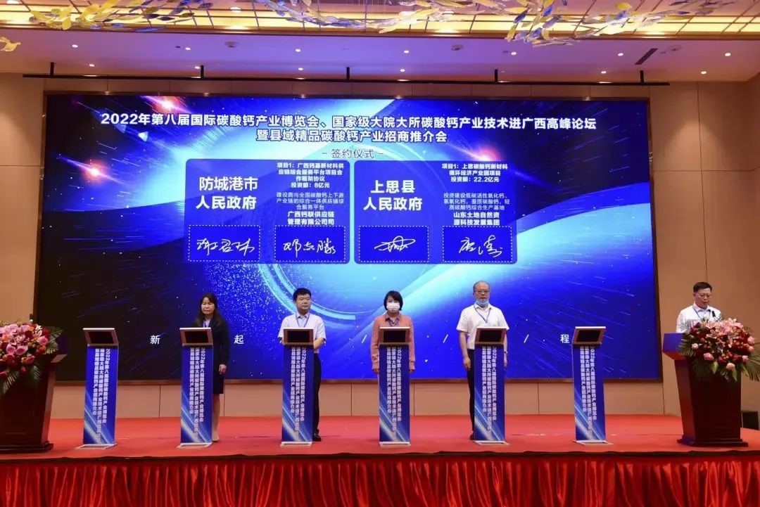 上思縣人民政府毛玉虹副縣長(zhǎng)與山東土地自然資源科技發(fā)展集團(tuán)有限公司唐濤副總經(jīng)理,簽訂投資22.2億元建設(shè)“上思碳酸鈣新材料循環(huán)經(jīng)濟(jì)產(chǎn)業(yè)園項(xiàng)目”協(xié)議。