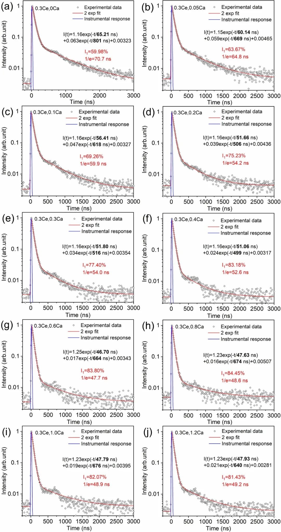 不同Ca2+摻雜濃度Ce,Ca:LuAG透明陶瓷的閃爍衰減曲線