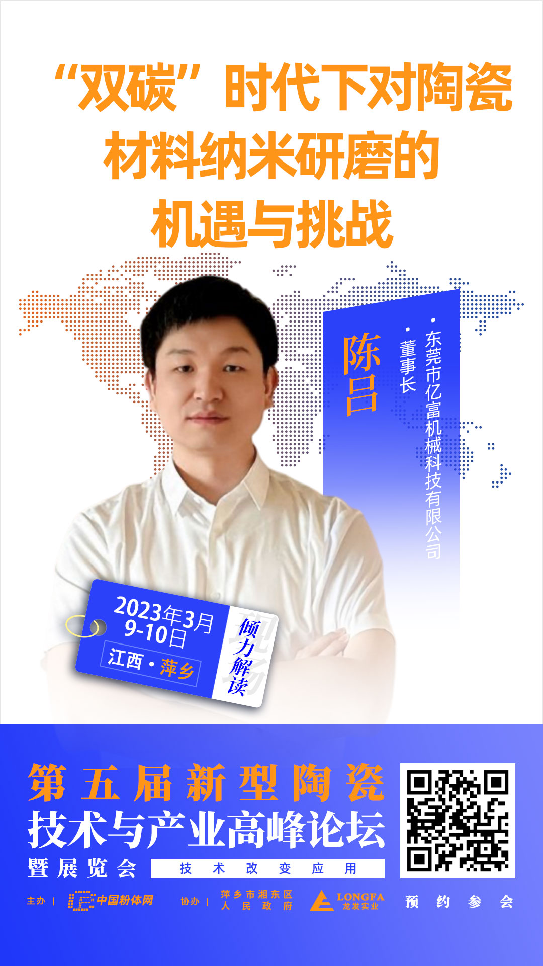 2023年3月9-10日,中國(guó)粉體網(wǎng)將在江西萍鄉(xiāng)舉辦“2022第五屆新型陶瓷技術(shù)與產(chǎn)業(yè)高峰論壇”,我們邀請(qǐng)到東莞市億富機(jī)械科技有限公司總經(jīng)理陳呂先生作題為《雙碳時(shí)代下對(duì)陶瓷材料納米研磨的機(jī)遇與挑戰(zhàn)》的報(bào)告。屆時(shí),陳總將對(duì)納米砂磨機(jī)在先進(jìn)陶瓷制備中的實(shí)際應(yīng)用情況進(jìn)行介紹,以期給予納米陶瓷廠家一些設(shè)備選擇方面的參考。