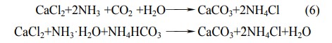 由以上反應(yīng)式可見,CO2碳化和碳酸氫銨碳化除得到CaCO3外,副產(chǎn)物為NH4Cl,可以回收作為浸取劑以實(shí)現(xiàn)循環(huán)利用。