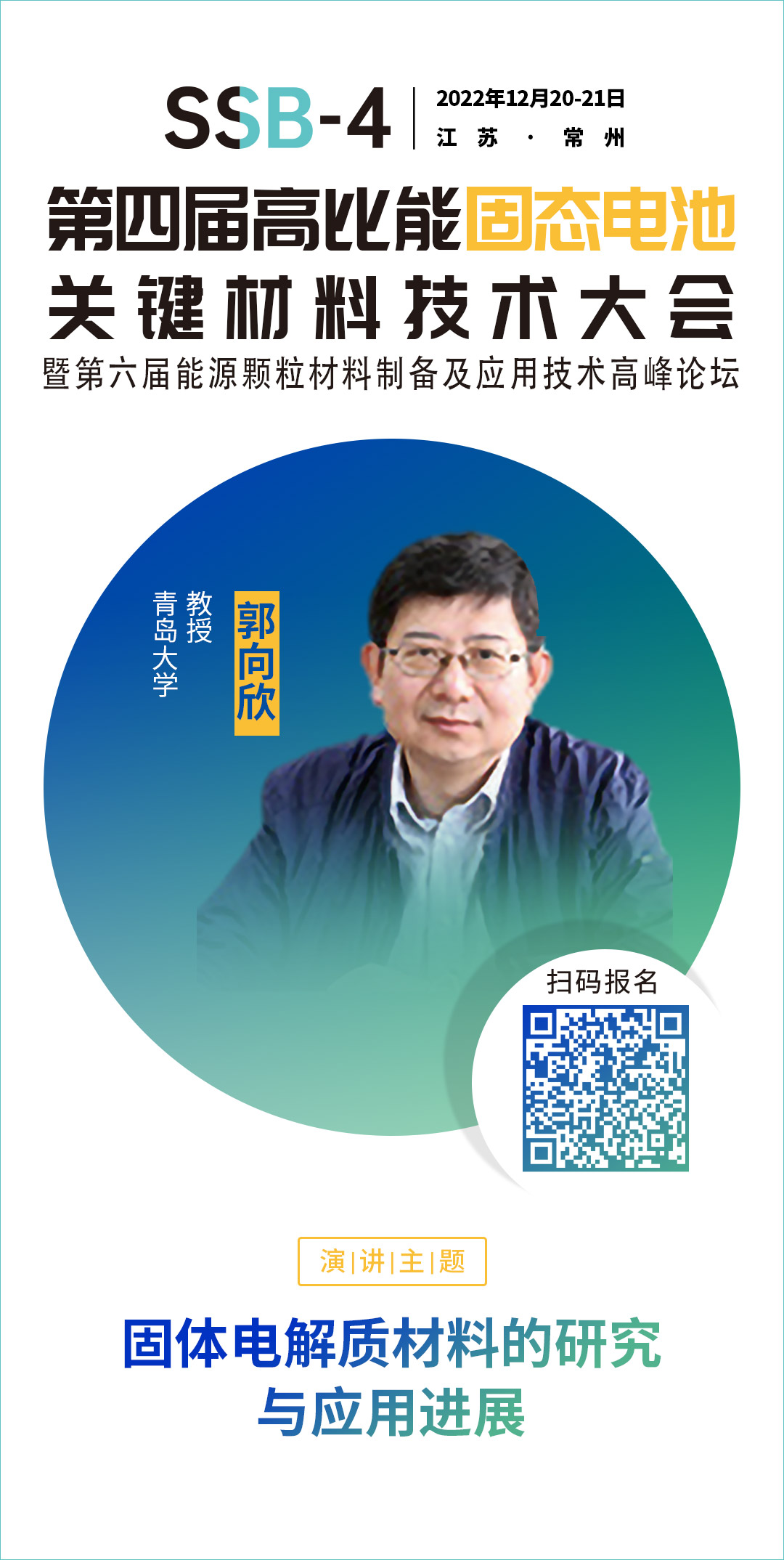 有鑒于此,中國(guó)粉體網(wǎng)將于12月20-21日在常州舉辦第四屆高比能固態(tài)電池關(guān)鍵材料技術(shù)大會(huì),為致力于固態(tài)電池技術(shù)開(kāi)發(fā)的企業(yè),科研院校,以及電動(dòng)車、儲(chǔ)能、特種應(yīng)用等終端企業(yè)提供信息交流的平臺(tái),開(kāi)展產(chǎn)、學(xué)、研合作,共同推動(dòng)行業(yè)發(fā)展。屆時(shí),青島大學(xué)郭向欣教授將作題為《固體電解質(zhì)材料的研究與應(yīng)用進(jìn)展》的報(bào)告。