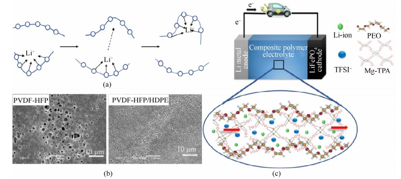 圖1(a)Li+在PEO基質(zhì)中的傳輸機(jī)理示意圖;(b)PVDF-HFP和PVDF-HFP/HDPE膜的掃描電鏡圖片;(c)鋰離子在含有Mg-TPAMOF的復(fù)合聚合物電解質(zhì)中的遷移示意圖