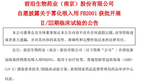 中國粉體網(wǎng)訊 近日,前沿生物藥業(yè)(南京)股份有限公司(“公司”)在研抗新冠病毒藥物霧化吸入用FB2001,擬用于治療輕型、普通型新型冠狀病毒(SARSCoV-2)感染患者的Ⅱ/Ⅲ臨床試驗(yàn)方案,獲得國家藥品監(jiān)督管理局藥品審評(píng)中心同意。