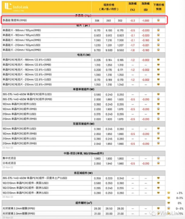 據(jù)PV infolink在11月23日最新公布的報(bào)價(jià)顯示,本周多晶硅價(jià)格出現(xiàn)下降,均價(jià)由303元/kg下降至302元/kg,降幅0.3%。這也是多晶硅價(jià)格年內(nèi)首次出現(xiàn)下降。