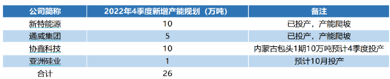 另一個(gè)不容忽視的因素是,隨著今年國內(nèi)各大硅料玩家大幅擴(kuò)充產(chǎn)能,新擴(kuò)多晶硅產(chǎn)能有望在四季度加速釋放。包括通威股份、協(xié)鑫科技等硅料龍頭均在持續(xù)加碼硅料項(xiàng)目建設(shè)。