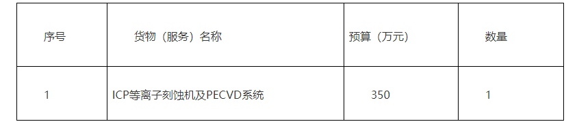 等離子刻蝕機(jī)——ICP及PECVD系統(tǒng) 招標(biāo)項(xiàng)目的潛在投標(biāo)人應(yīng)在武漢市武昌區(qū)民主路789號南國悅公館1206室獲取招標(biāo)文件,并于2022年12月19日 09點(diǎn)30分(北京時(shí)間)前遞交投標(biāo)文件。