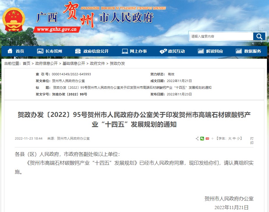 中國(guó)粉體網(wǎng)訊 2022年11月22日,賀州市人民政府辦公室印發(fā)了《賀州市高端石材碳酸鈣產(chǎn)業(yè)“十四五”發(fā)展規(guī)劃》(以下簡(jiǎn)稱:《規(guī)劃》),并將“強(qiáng)龍頭重大項(xiàng)目”和特色“園中園”建設(shè)重大項(xiàng)目視為產(chǎn)業(yè)規(guī)劃核心內(nèi)容。