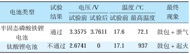 短路試驗中,兩種電池的最大短路電流均大于800A,最大溫升在100K左右,半固態(tài)磷酸鐵鋰電池存在明顯鼓包現(xiàn)象,鈦酸鋰電池?zé)o明顯表現(xiàn)現(xiàn)象。
