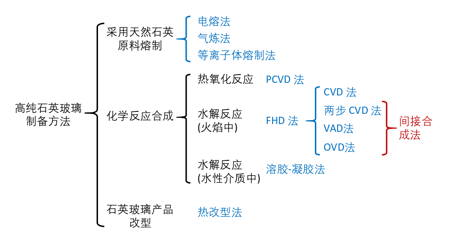 石英玻璃的制備方法可以分為兩大類。第一類是以天然石英晶體或硅石為原料進(jìn)行熔制得到,稱為天然石英玻璃。根據(jù)熱源和工藝的不同可以將其細(xì)分為電熔法、氣煉法、等離子體熔制法等。其中,電熔法出品率高且經(jīng)濟(jì),是國(guó)內(nèi)最為普遍的工藝方法,電熔法的成品率除了取決于工藝,更大程度上跟原材料有關(guān)。氫氧焰制備的石英玻璃雖然能減少雜質(zhì)含量,但是成品的羥基含量過(guò)高。等離子體沉積法能同時(shí)解決雜質(zhì)和羥基含量,但是成本高,所以實(shí)現(xiàn)大量產(chǎn)業(yè)化較為困難。