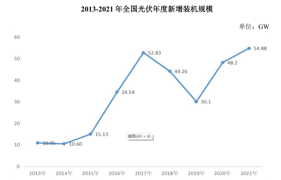 2013-2021全國光伏年度新增裝機(jī)規(guī)模