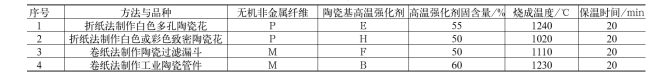 陶瓷基高溫強化劑液體由作為固體組分的無機非金屬材料和水組成,固含量為45%~65%;燒結(jié)條件為:將干燥的半成品在30~50min內(nèi)(因產(chǎn)品不同而變化)隨爐升溫至燒結(jié)溫度,保溫?zé)Y(jié)20min后,關(guān)閉電爐,隨爐冷卻至室溫,燒結(jié)溫度1000~1300℃(因產(chǎn)品不同而變化),得陶瓷基復(fù)合材料產(chǎn)品。通過大量的實驗和研究,研究人員作出了系列薄壁陶瓷基復(fù)合材料產(chǎn)品,如下表: