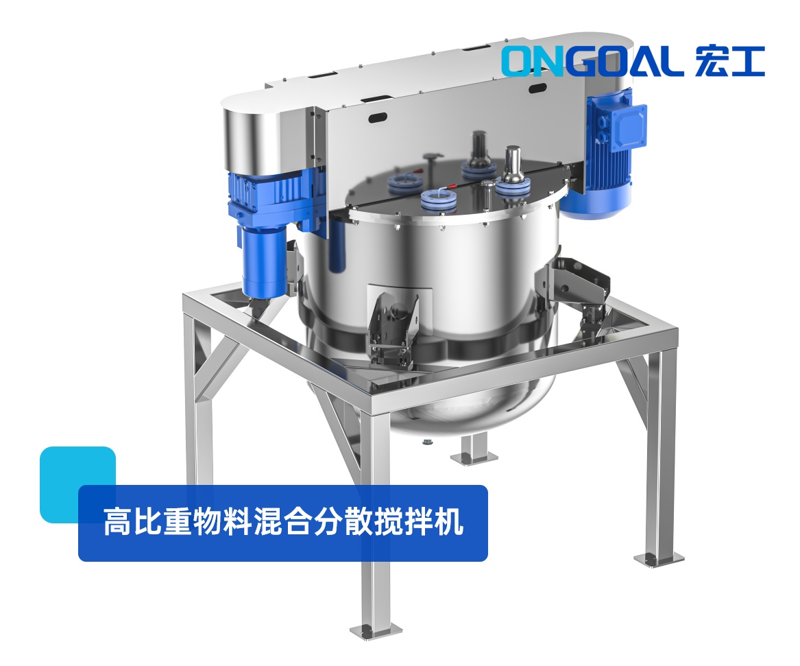 針對陶瓷材料、鐵氧磁性材料、粉末冶金材料等高密度固相顆粒的混合需求,宏工自主研發(fā)了主要用于液-固相物料的高比重物料混合分散攪拌機(jī),能實(shí)現(xiàn)快速均勻無沉降混合。