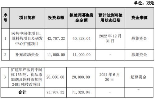 經(jīng)中國證券監(jiān)督管理委員會(huì)《關(guān)于同意誠達(dá)藥業(yè)股份有限公司首次公開發(fā)行股票注冊的批復(fù)》(證監(jiān)許可[2021]3857號)同意注冊,公司首次公開發(fā)行人民幣普通股(A股)股票24,174,035股,發(fā)行價(jià)格為每股72.69元,募集資金總額為175,721.06萬元,扣除發(fā)行費(fèi)用共計(jì)13,576.31萬元(不含稅)后,募集資金凈額為162,144.75萬元。公司公開發(fā)行股票募集資金(含超募資金)擬投資于以下項(xiàng)目: