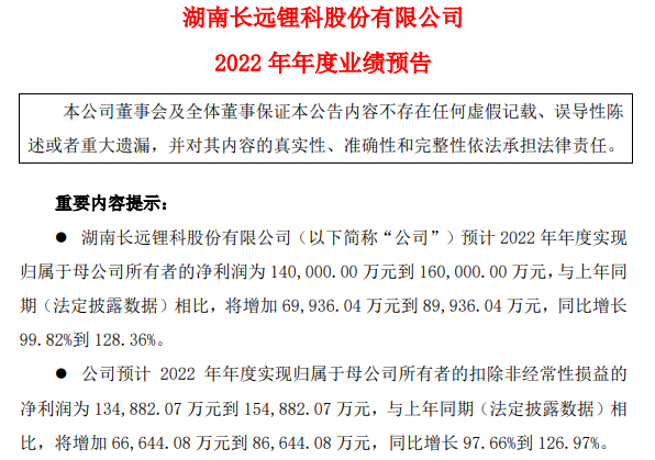 中國粉體網(wǎng)訊 1月3日,長遠(yuǎn)鋰科發(fā)布2022年業(yè)績預(yù)告,預(yù)計2022年年度實現(xiàn)歸屬于母公司所有者凈利潤為14億元到16億元,與上年同期相比,將增加6.9億元到8.9億元,同比增長99.82%到128.36%。