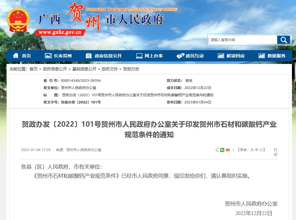 中國粉體網(wǎng)訊 近日,廣西賀政辦發(fā)〔2022〕101號賀州市人民政府印發(fā)《賀州市石材和碳酸鈣產(chǎn)業(yè)規(guī)范條件》,將從資源開采、企業(yè)布局、生產(chǎn)規(guī)模、產(chǎn)品質(zhì)量、工藝和裝備、能用消耗、環(huán)境保護等方面進一步規(guī)范碳酸鈣資源的開發(fā)利用和管理。值得一提的是,本規(guī)范條件中石材和碳酸鈣企業(yè)是指利用碳酸鹽巖礦產(chǎn)資源生產(chǎn)重質(zhì)碳酸鈣、輕質(zhì)碳酸鈣、氧化鈣、氫氧化鈣、大理石板材、人造石(人造崗石、無機石)等石材產(chǎn)品及碳酸鈣產(chǎn)品企業(yè);花崗巖礦產(chǎn)資源生產(chǎn)的花崗巖板材等石材產(chǎn)品企業(yè)。
