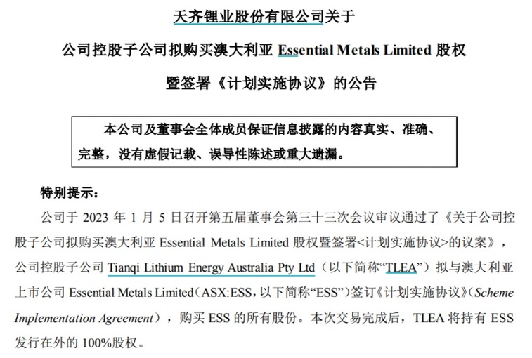不過,天齊鋰業(yè)稱,本次交易尚需經(jīng)ESS半數(shù)以上股東參與投票,且在參與投票股東中同意的股東合計持有股數(shù)占參與投票有表決權(quán)股份總數(shù)的75%以上,同時需取得澳大利亞證券投資委員會、澳大利亞證券交易所及澳大利亞當(dāng)?shù)胤ㄔ旱扔袡?quán)部門的審核批準(zhǔn),滿足《計劃實施協(xié)議》約定的交易先決條件,因此該交易的實施尚具有不確定性。