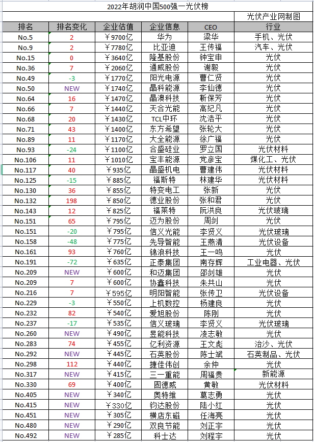 中國粉體網(wǎng)訊 近日,胡潤研究院發(fā)布了《2022胡潤中國500強(qiáng)》榜單,列出了中國500強(qiáng)非國有企業(yè),按照企業(yè)市值或估值進(jìn)行排名。在本次公布的榜單中,光伏相關(guān)企業(yè)因上榜數(shù)量眾多,足有40家,引起了行業(yè)內(nèi)外的廣泛關(guān)注。