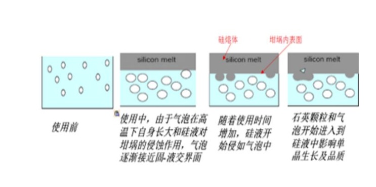 從質(zhì)量方面看,石英坩堝內(nèi)層由于與硅液直接接觸,在拉晶過程中不斷向硅液中溶解,并且坩堝透明層微氣泡不斷長大至破裂將向硅液中釋放石英顆粒和微氣泡,這些雜質(zhì)又以微顆粒和微氣泡的形式伴隨硅液流遍整個硅熔體,直接影響到硅的成晶和單晶的質(zhì)量。