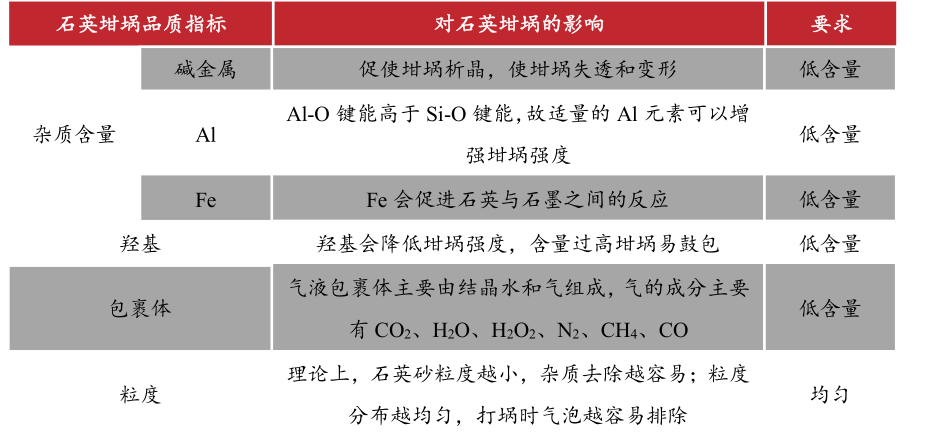 石英坩堝直接與硅液接觸,若其生產(chǎn)過程中未能有效控制雜質(zhì)、氣泡,易影響拉晶質(zhì)量,甚至導(dǎo)致拉晶失敗、投料報廢,由于單晶硅片對純度要求高、且單次拉晶成本較高,因此對石英坩堝在純度、氣泡表現(xiàn)、品質(zhì)穩(wěn)定性方面具有較高的要求: