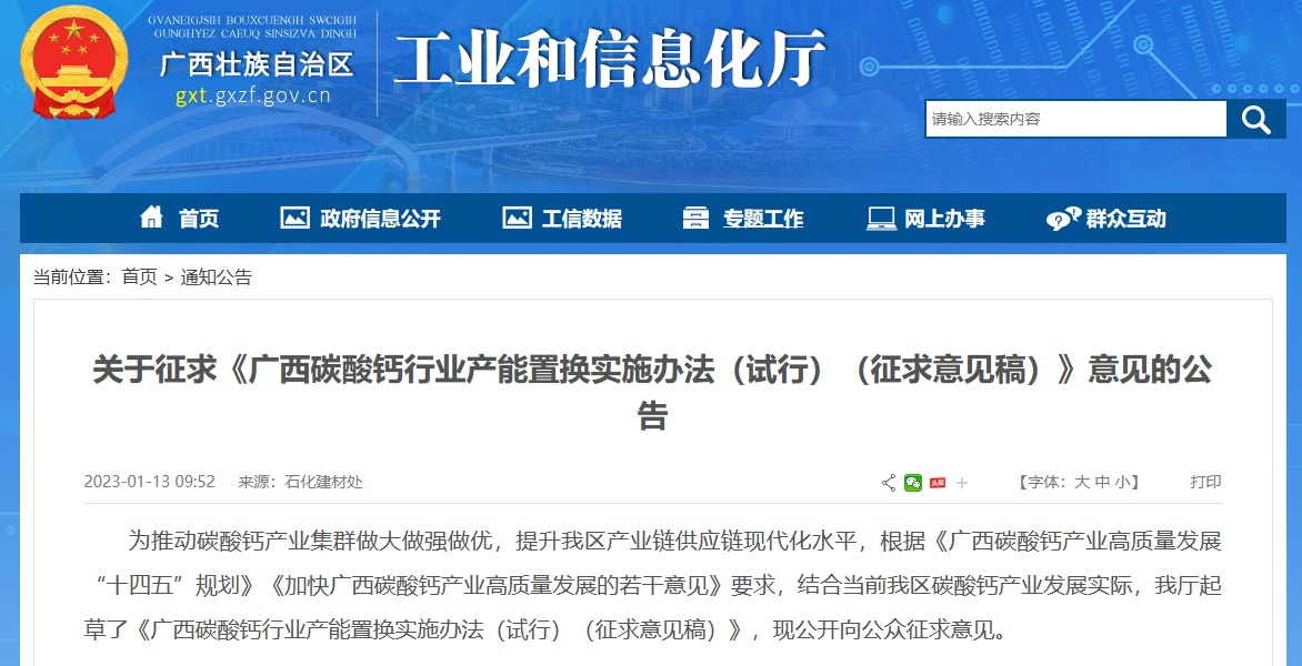 中國(guó)粉體網(wǎng)訊 日前,廣西工信廳發(fā)布《廣西碳酸鈣行業(yè)產(chǎn)能置換實(shí)施辦法(試行)(征求意見(jiàn)稿)》,明確提出,嚴(yán)禁備案和建設(shè)擴(kuò)大產(chǎn)能的碳酸鈣粉體加工項(xiàng)目,確有必要建設(shè)的,必須制定產(chǎn)能置換方案,實(shí)施產(chǎn)能置換。