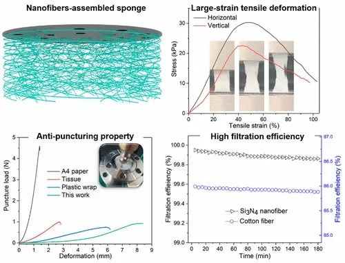 近日,我院王紅潔教授課題組發(fā)展了一種可控的化學(xué)氣相反應(yīng)方法,開發(fā)出一種由取向性高且相互糾纏的氮化硅納米纖維構(gòu)筑的超輕陶瓷海綿。該材料不僅具有良好的拉伸(20%拉伸應(yīng)變下可彈性回復(fù)、斷裂伸長(zhǎng)率高達(dá)80%以上)和壓縮(80%應(yīng)變完全回彈)性能,還表現(xiàn)出優(yōu)異的抗穿刺性。得益于獨(dú)特的3D網(wǎng)絡(luò)結(jié)構(gòu),該陶瓷海綿空氣污染物的過濾效率高達(dá)99.8%以上,而其壓降卻僅為棉纖維濾芯的38%。這些綜合性能使其具備了在復(fù)雜應(yīng)力條件下的長(zhǎng)效空氣過濾能力,在空氣污染治理等方面具有潛在應(yīng)用價(jià)值。