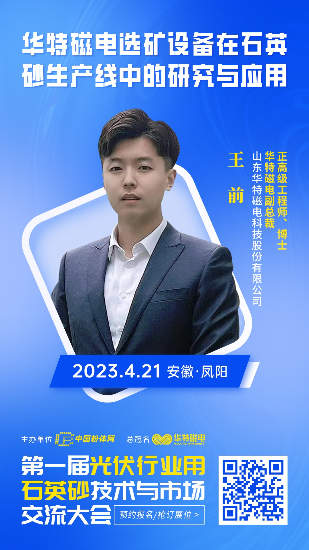 2023年4月21日,中國粉體網(wǎng)將在安徽鳳陽舉辦“第一屆光伏行業(yè)用石英砂技術(shù)與市場交流大會”。華特磁電副總裁、正高級工程師、博士王前將帶來題為《華特磁電選礦設(shè)備在石英砂生產(chǎn)線中的研究與應(yīng)用》的報告。