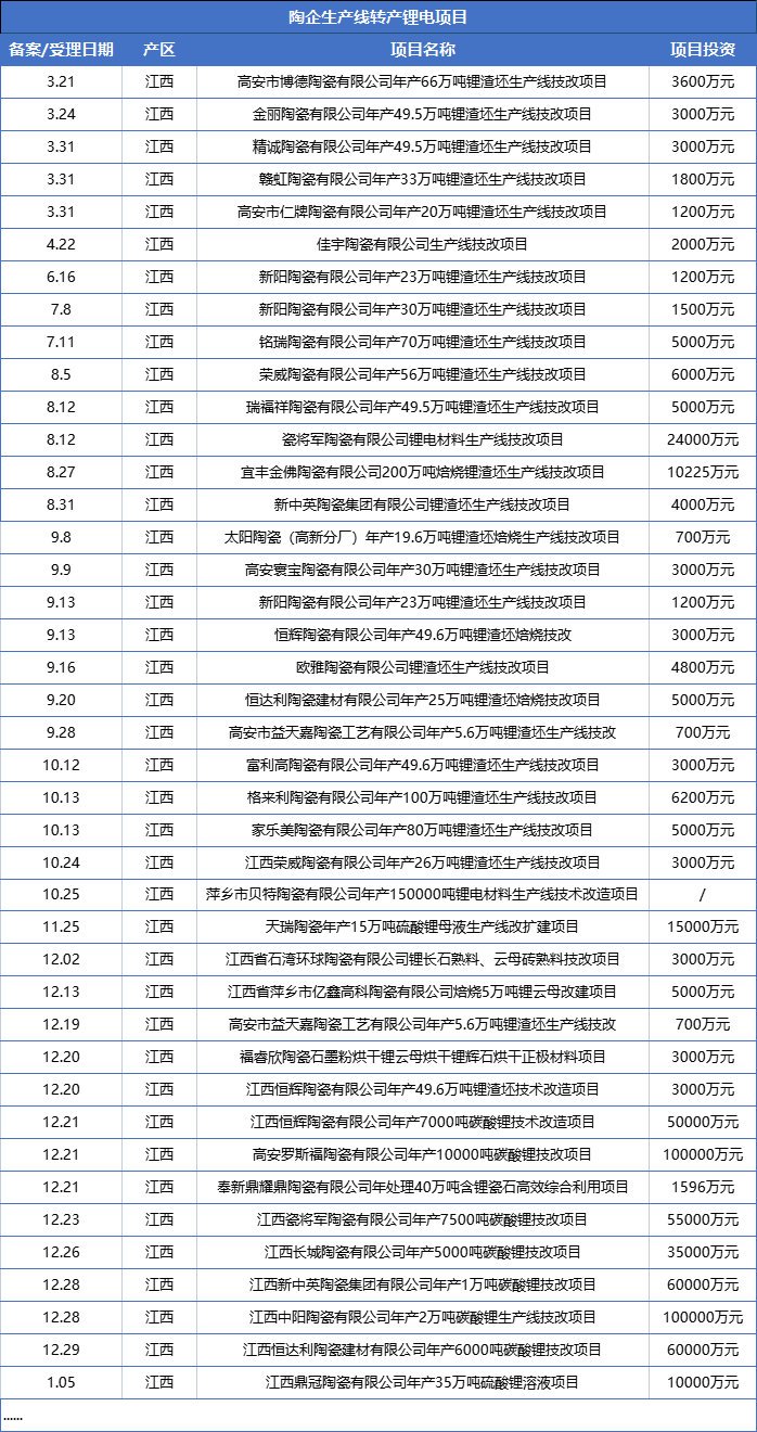 僅2022年3月底至2023年1月,江西便有 38家陶企已轉產鋰電,江西高安產區(qū)更是合計超70條陶瓷生產線將技改成“鋰渣坯生產線”、“碳酸鋰生產線”等,累計投入61.14億元。