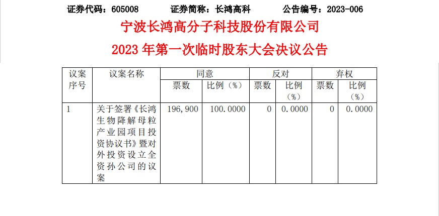 2月16日,長(zhǎng)鴻高科發(fā)布2023年第一次臨時(shí)股東大會(huì)決議公告,本次股東大會(huì)表決通過(guò)了“關(guān)于簽署<長(zhǎng)鴻生物降解母粒產(chǎn)業(yè)園項(xiàng)目投資協(xié)議書(shū)>暨對(duì)外投資設(shè)立全資孫公司的議案”。這也意味著長(zhǎng)鴻高科可降解塑料全產(chǎn)業(yè)鏈上下游一體化布局又邁出關(guān)鍵一步,再獲實(shí)質(zhì)性進(jìn)展。