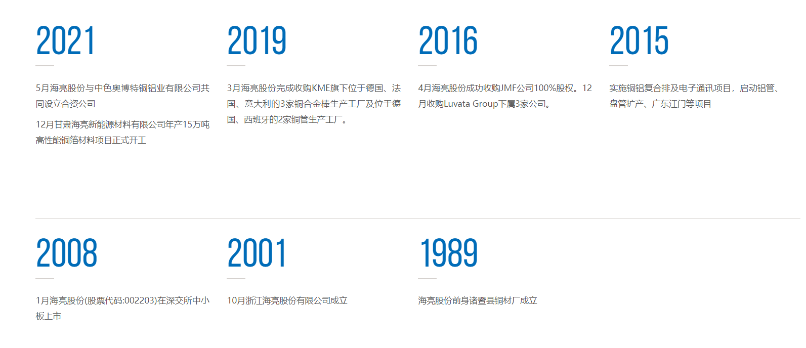 根據(jù)公開資料顯示,海亮股份前身為1989年成立的諸暨縣銅材廠。2001年,公司完成股份制改造,更名為浙江海亮股份有限公司。2002年,公司銅加工材產(chǎn)量達(dá)到12萬噸,成為中國首家年產(chǎn)量突破10萬噸的銅加工企業(yè)。2008年公司在深交所掛牌上市。上市后,海亮股份積極布局國外市場。2009年,公司在美國設(shè)立分公司,2016年正式開啟全球化生產(chǎn)的經(jīng)營戰(zhàn)略,先后收購美國JMF公司、芬蘭LuvataGroup和德國KMEGroup旗下生產(chǎn)工廠。
